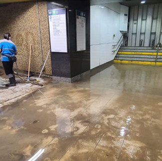 本港近來世紀豪雨,黑色暴雨生效至今超過15 小時,造成港九新界多處出現嚴重水浸,其中港鐵站有多個站出現雨水由地面衝落入口大堂情況,多個港鐵站大堂需要緊急關閉,其中以黃大仙港鐵站洪水分別由龍翔道路面,由上而下不斷衝入大堂,以致列車未能停站,今早工作人員不停撥走黃泥水及清理大堂沙泥。
